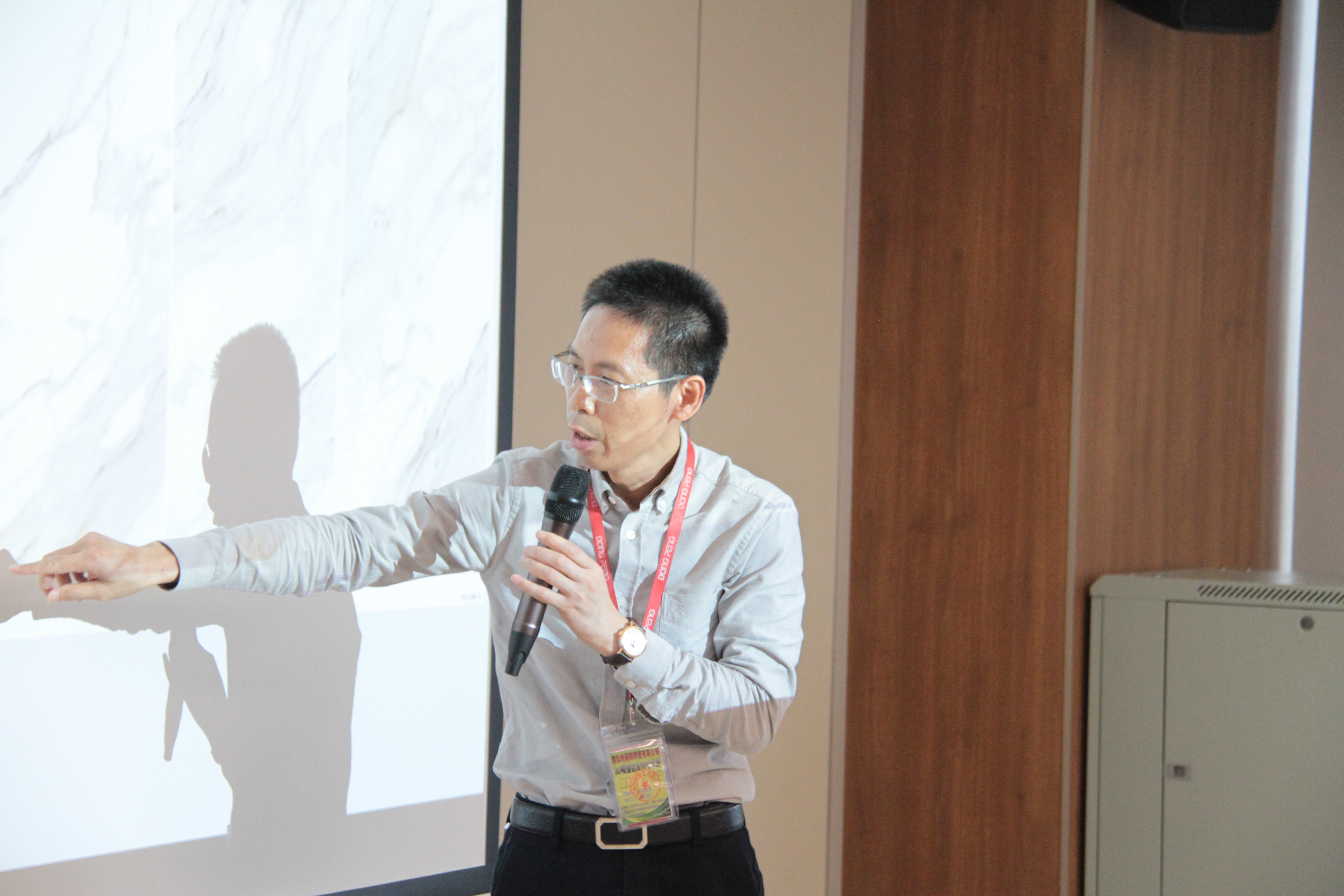 ?東鵬世界印象管理中心副總監(jiān)曾志鋒向經(jīng)銷商代表們講解通過如何設(shè)置展廳燈光的明暗差異,突顯產(chǎn)品與功能間。