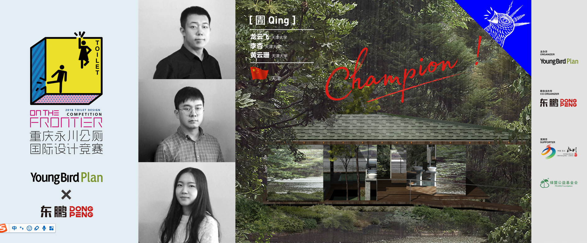 2019年1月12日,在歷時3個月,足跡遍及海內外多座高校,吸引全球31個國家,181個城市的1287位選手參與,上千份設計精品同臺PK的“熱浪”后,東鵬?Young Bird Plan 2018“On the Frontier”重慶永川公廁國際設計競賽暨“鄉(xiāng)村振興”主題論壇迎來了第一季的“收官之站”,繼深圳大學、西南交通大學、北京中央美術學院三站之后,素有國家“雙一流”(世界一流大學和一流學科)榮譽稱號的同濟大學再度接棒,三強選手齊聚同濟大學建筑與城市規(guī)劃學院,角逐本次冠軍。